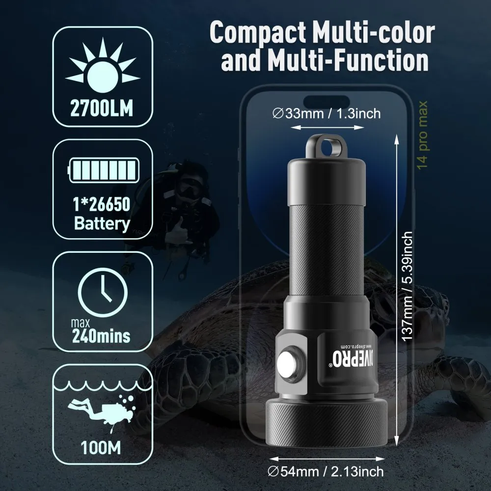 DIVEPRO M27 – 2700 Lumenów Wielokolorowa i Wielofunkcyjna Latarka Nurkowa