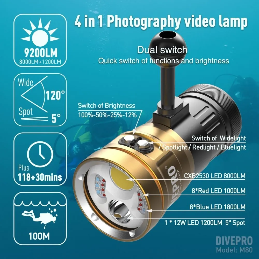 DIVEPRO M80 – 9200 Lumenów, Wielofunkcyjna Latarka Nurkowa z Różnymi Trybami Światła
