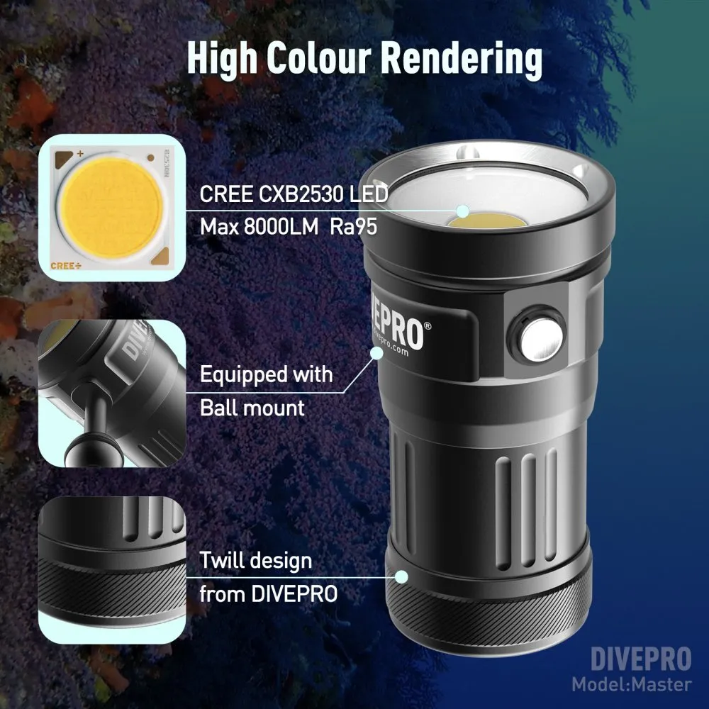 DIVEPRO MASTER – 8000 Lumenów CRI95 Profesjonalna Lampa do Nurkowania i Fotografii Podwodnej
