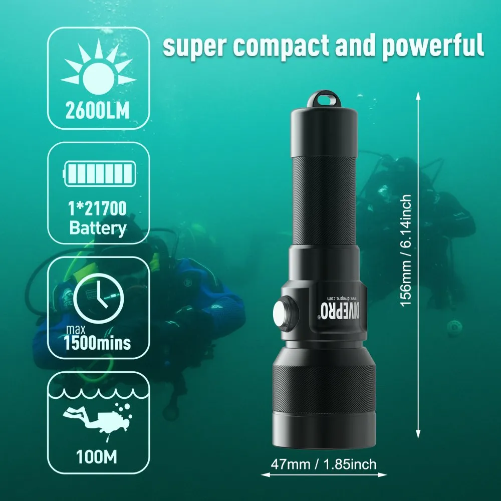 DIVEPRO S26 – 2600 Lumenów Super Kompaktowa Latarka Nurkowa z Przełącznikiem