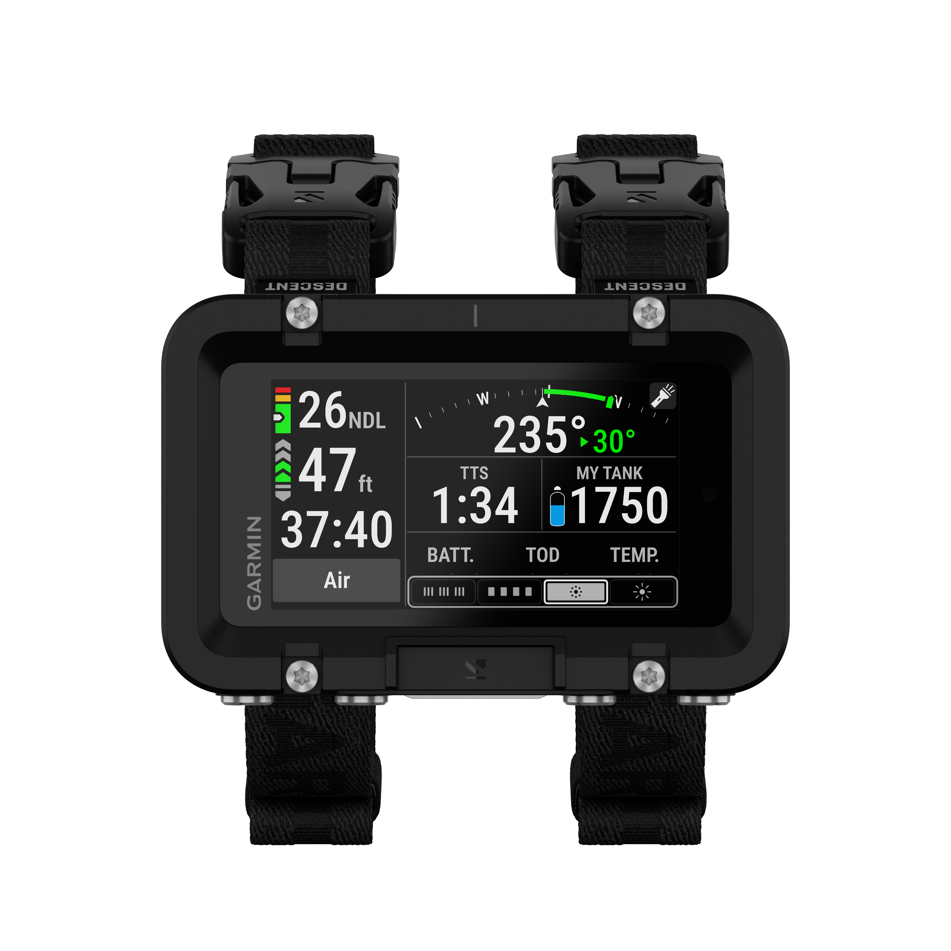 Po sparowaniu z opcjonalnym transmiterem Garmin Descent T2 (sprzedawanym osobno), system umożliwia monitorowanie ciśnienia w butlach oraz przesył danych bezpośrednio do komputera nurkowego, nawet w wymagających warunkach technicznych.